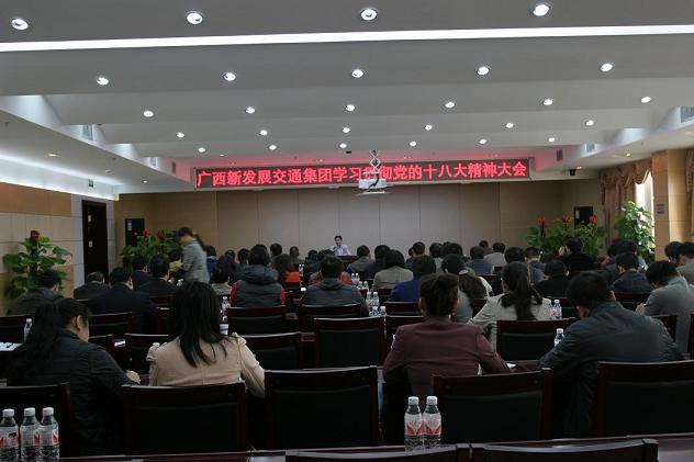 為深入學(xué)習(xí)貫徹落實黨的十八大會議精神,在組織廣大黨員干部職工參加支部集中學(xué)習(xí)、科室集中學(xué)習(xí)、業(yè)余自學(xué)的基礎(chǔ)上,12月6日上午,廣西新發(fā)展交通集團黨委在南寧召開了集中學(xué)習(xí)貫徹黨的十八大精神專題輔導(dǎo)大會,集中聽取了中國社會科學(xué)院黨組成員、副院長兼當(dāng)代中國研究所所長、黨組書記李捷同志關(guān)于《深入學(xué)習(xí)貫徹十八大精神》的視頻專題輔導(dǎo)講座。集團公司領(lǐng)導(dǎo)班子成員、集團公司機關(guān)全體人員,直屬各單位領(lǐng)導(dǎo)班子成員、黨委辦公室負責(zé)人,廣西公路橋梁工程總公司各分(子)公司黨政一把手共80余人參加了會議。講座從黨的十八大主題、科學(xué)發(fā)展觀、中國特色社會主義道路、全面建成小康社會的新論斷及關(guān)于黨的建設(shè)要求的總體布局等五個方面進行了深入解答,讓廣大黨員干部職工受益匪淺。